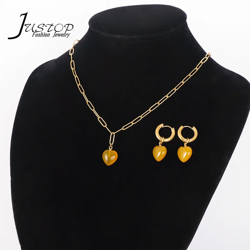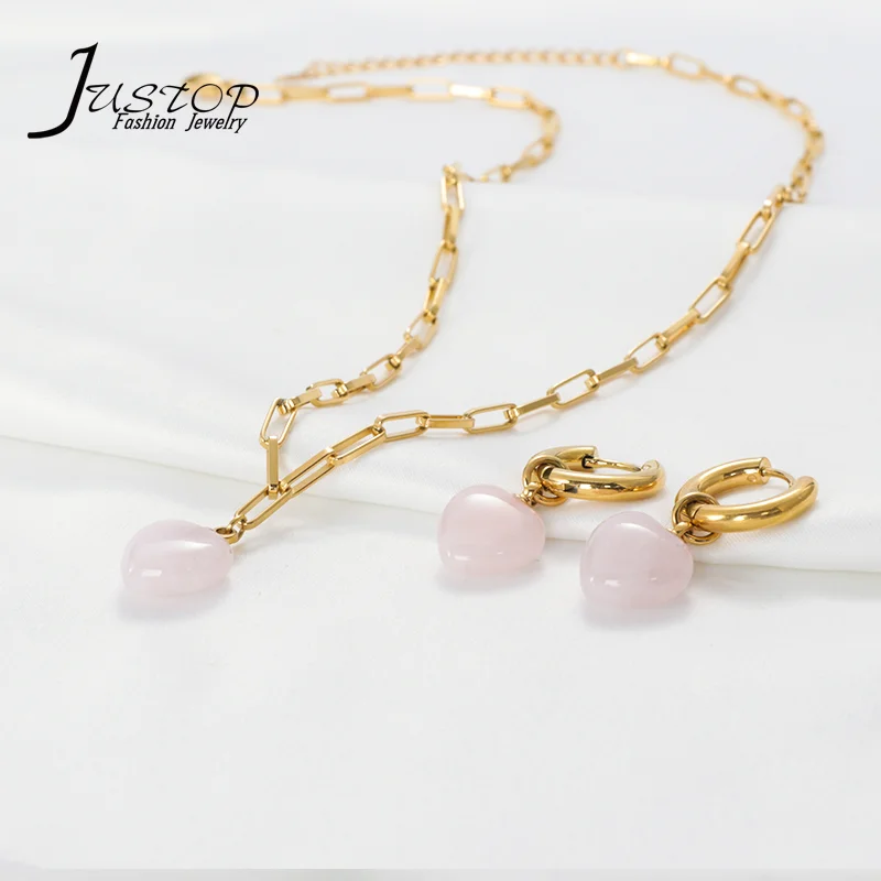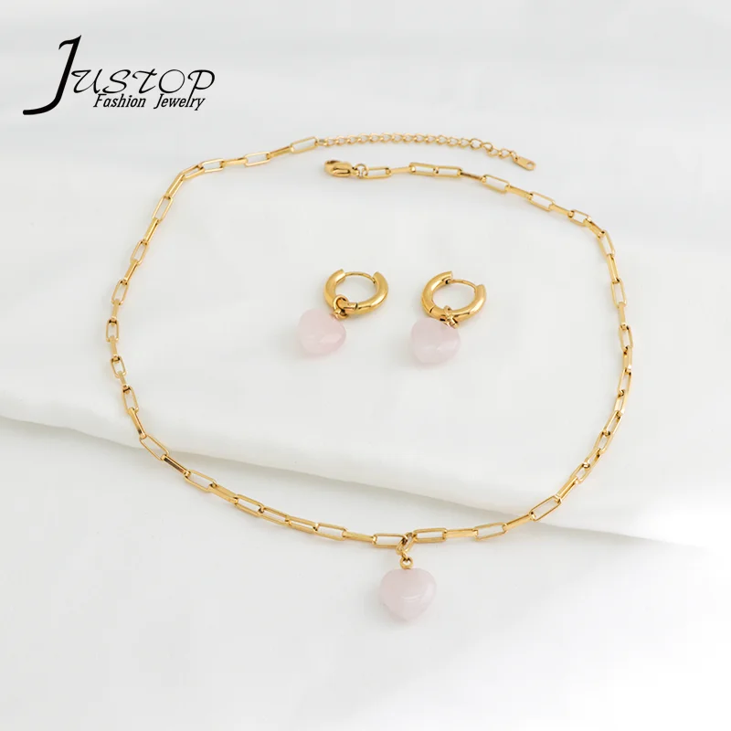 Stainless Steel Link Chain Jewelry Rose Quartz Heart Natural Stone Earring Necklace Women Jewelry Set